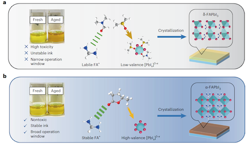 Recently, Yixin Zhao's research group from the School of Environmental Science and Engineering at Shanghai Jiao Tong University published a research paper entitled "Green solvent enabled scalable processing of perovskite solar cells with high efficiency” in Nature Sustainability. They reported an eco-friendly solvent of γ-valerolactone (GVL) for sustainable fabrication of perovskites, which solve the challenges of toxicity, ink stability and operation window for the solution based scalable fabrication of perovskite solar modules. This work provides insights into the interaction between the GVL solvent and perovskite precursors, which would be of great help for the stability and performance enhancement of perovskites in scalable optoelectronic applications.