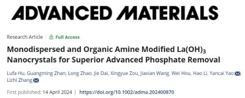 环院智慧|张礼知团队在Adv. Mater. 发文报道单分散有机胺修饰氢氧化镧纳米晶高效深度除磷