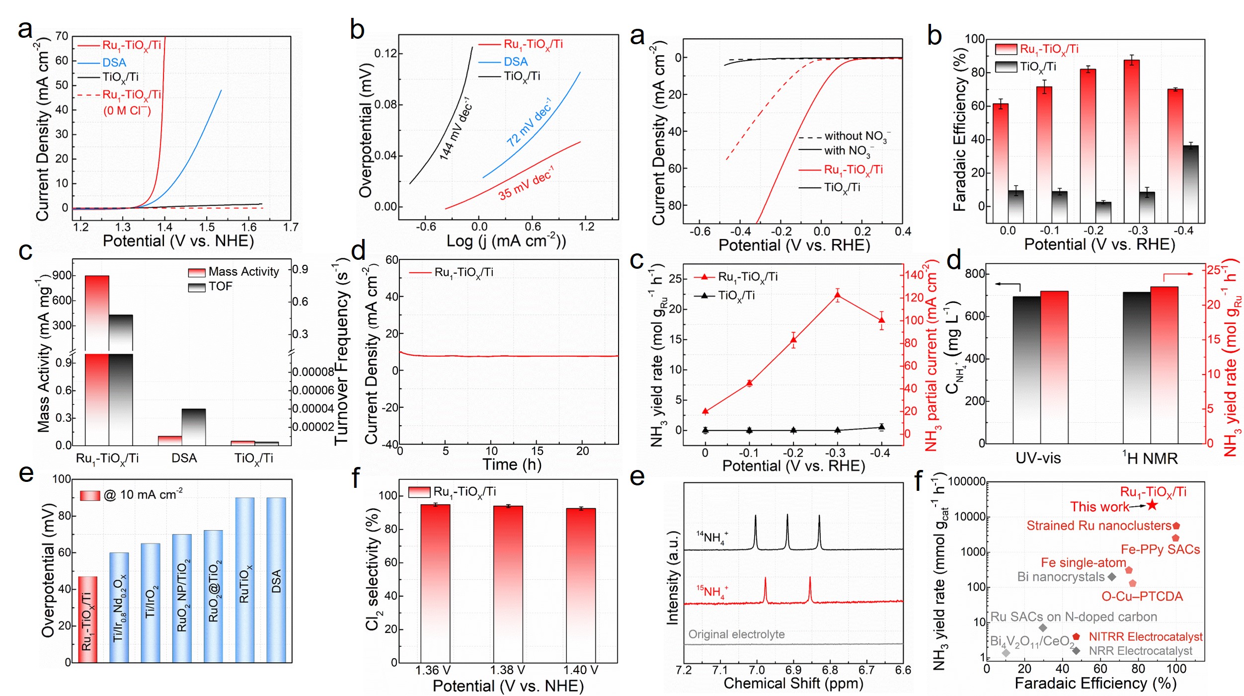 图3. Ru1-TiOx/Ti的电化学析氯性能和电化学选择性还原硝酸根制氨性能