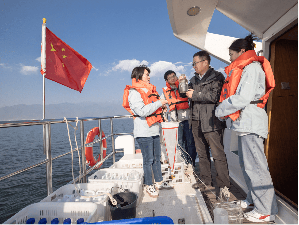 党支部书记王欣泽与工作人员在洱海采样现场交流水样采集、分析工作