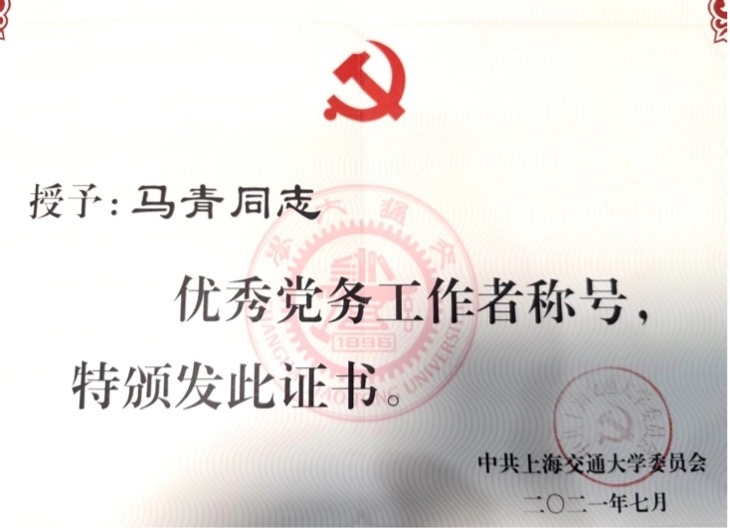 2021年,支部党员马青荣获韩国av 优秀党务工作者称号