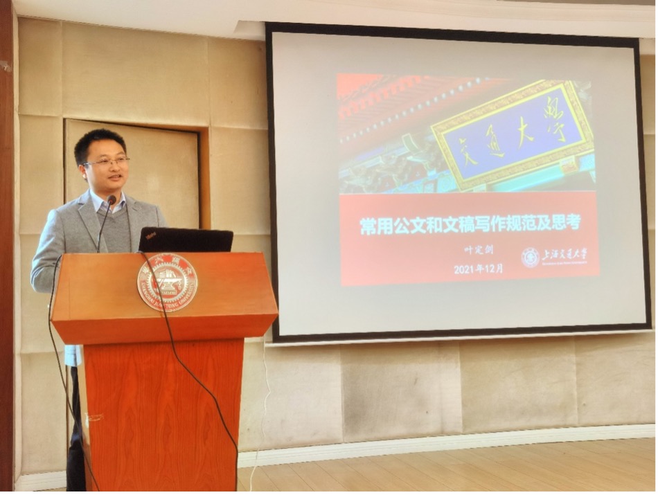 2021年12月,学院召开“行政及教辅人员提升管理和服务效能”会议,特邀嘉宾药学院党委副书记叶定剑作题为《常用公文和文稿写作规范及思考》的报告