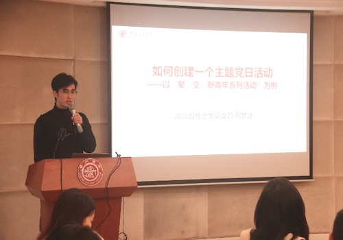 2022级博士生党支部书记何梦达以《如何创建支部主题党日活动》为题作交流发言,他以党支部开展的“聚‘交’新青年系列活动”为例,通过活动创建、活动开展、活动总结三个方面,向大家交流了创建主题党日活动的经验与做法。