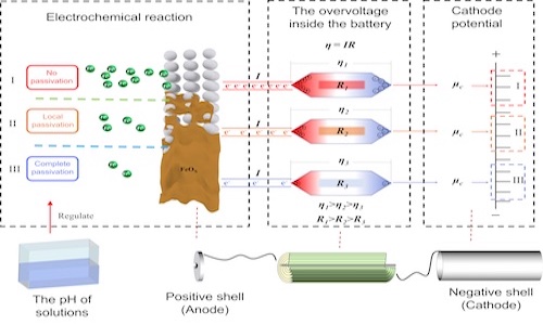 基于通过电化学反应利用废旧锂电池剩余能量,本团队创造性地构建了通过调控电池阴极电位进行电化学还原利用废旧锂电池中剩余能量的机理模型与方法。首先发现了废旧锂电池剩余能量再利用的关键挑战是电化学反应过程中不稳定的电池的阴极电位。面对这一挑战,本文建立了一个电化学机理模型,揭示了溶液pH对电池阴极电位和电流的响应机制:(1)电池内部的电流I可以通过溶液的pH值控制电池放电决速步骤——电池阳极铁的氧化速率进行调控;(2)电池电流I的变化在受到废旧锂电池高内阻R特性的影响会引发电池内部较高程度的过电压η响应(η = IR),从而改变了电池的输出电压和阴极电位;(3)基于电池阳极Fe的氧化存在钝化区间的特性,通过利用溶液pH到达钝化临界区所导致的电化学反应速率和电池电流发生的突变,实现了电池的阴极电位随溶液pH的调控从连续化转为区间化。实验结果表明,电池的阴极电位在Fe完全钝化(pH<3.4)、Fe局部钝化(pH≈3.4)、Fe不钝化(pH>4)时分别为>-0.47V, -0.47V—-0.82V,<-0.82V。基于此机制,本研究建立了利用废旧锂电池剩余能量在不同电位和电流需求的场景中应用的方法。此方法可以利用废旧锂电池剩余能量用以去除废水中的重金属(Cu,Cd,Zn),去除废水中的Cr(VI)和回收溶液中的铜,且电池的能量利用率可以分别达到35.08%、88.4%和84.7%。