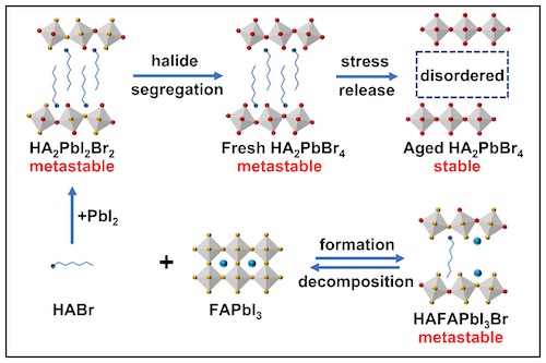 赵一新教授团队长期致力于钙钛矿太阳能电池的研究。团队围绕光伏产业高效率和高稳定性的目标,针对钙钛矿晶体生长、缺陷钝化、结构稳定化等关键科学问题,完成了一系列有特色的工作。在此次发表的工作中,发现新制备的RP型己胺铅溴(HA2PbBr4)单晶处于亚稳态,其结构会随着老化而发生晶格应变的弛豫并实现稳定。相比而言,晶格应变已得到释放的HA2PbBr4薄膜具有更高的结构稳定性,而己胺铅碘(HA2PbI4)单晶则不会随着老化而发生晶体结构的变化。当采用HABr作为甲脒铅碘(FAPbI3)钙钛矿薄膜的修饰剂时, HABr可与三维的FAPbI3反应并嵌入其晶格,形成HAFAPbI3Br的混合阳离子混合卤化物二维钙钛矿。HAFAPbI3Br钙钛矿处于一种分解与生成的动态平衡中,并不是制备成太阳能电池器件的最佳选择。而通过HABr与PbI2反应形成的HA2PbI2Br2二维钙钛矿具有优秀的稳定化效果与缺陷钝化作用。