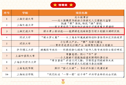 近日,由团市委、市委宣传部、市教卫工作党委、市教委、市精神文明办、市人大社会委、市政协社法委、市学联共同主办的2023年"知行杯"上海市大学生社会实践大赛落下帷幕。韩国av 参赛项目《绿水青山新动能——能源绿色低碳转型引领乡村振兴调研实践》在乡村振兴赛道荣获特等奖,助力交大再次问鼎“知行杯”。这也是环境学院首次在上海市“知行杯”决赛中荣获特等奖。