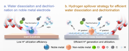 电化学水解离反应在能源和环境领域有广泛的应用。阴极上的水离解始于Volmer过程,即水分子得电子并分解为氢氧根和吸附态的原子氢(H*)。对于析氢反应(HER)而言,H*通过Tafel或Heyrovsky步骤产生氢气。然而,该HER过程对于电化学环境治理,特别是以H*作为还原活性物种的电化学脱氯技术而言,是非常不利的。目前,贵金属材料(如Pd、Pt、Ag)同时具有良好的水解离产H*活性和吸附活化C-Cl键的能力,被广泛用于电化学还原脱氯。但贵金属电极的H*吸附能力较弱,这使得其表面的H*非常容易复合产生氢气,降低H*利用效率。而在脱氯过程中,贵金属位点既要参与水分子吸附和解离反应,还要吸附氯代污染物完成脱氯过程,这种水分子和污染物分子的竞争反应必然降低活性位点利用效率。