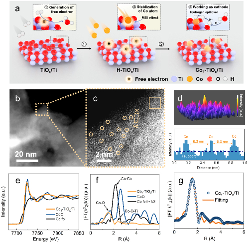 该团队利用泡沫钛表面原生钛氧化层构建氧空位锚定Co单原子,制备了单原子钴泡沫钛整体电极(Co1−TiOx/Ti),通过球差校正透射电镜(HAADF−STEM)和拓展X射线吸收精细结构谱(EXAFS)研究电极表面Co原子的局域结构,证明了Co1−TiOx/Ti电极表面Co物种以单原子存在形式,且Co−O配位数约为5。