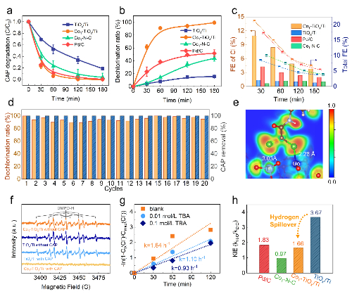 图4 单原子钴泡沫钛电极的氯霉素脱氯性能、机理研究
