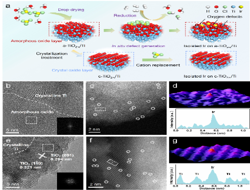 该团队通过精细控制退火条件,得到了具有不同结晶性氧化钛层的泡沫钛基底,再利用缺陷锚定策略,将Ir单原子分别锚定在非晶和结晶的钛氧化层上。高分辨透射电极(HRTEM)照片展示了两种泡沫钛基底上具有不同结晶性的钛氧化层。球差矫正高角环形暗场扫描透射电镜(HAADF-STEM)照片和三维原子重叠高斯函数拟合图(3D AOGF)证明了电极表面Ir的单原子存在形式。