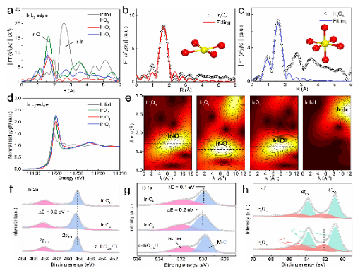 通过X射线光电子能谱(XPS)、X射线吸收精细结构谱(EXAFS)及其拟合结果等多项表征,该团队证实了泡沫钛表面氧化层的结晶度会强烈影响Ir单原子的局部配位环境,并进一步影响周围的电子结构。为方便表述,根据EXAFS拟合结果将锚定在非晶钛氧化层上的Ir单原子电极记为Ir1O4,而锚定在晶体钛氧化层上的Ir单原子电极记为Ir1O6。
