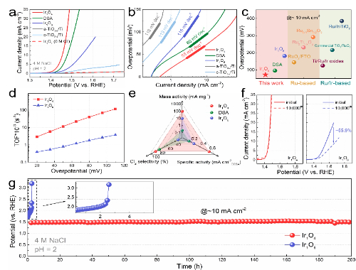 Ir1O4阳极展现出优异的CER活性和稳定性:仅需71.8 mV的过电位就达到10 mA cm-2,质量活性高达95 mA mgIr-1,这远远优于对应的Ir1O6阳极(181.4 mV, 9.35 mA mgIr–1)和商业DSA(95.8 mV, 0.20 mA mgIr+Ru–1)以及大多数报道的Ru/Ir基CER电催化剂。同时该电极也展现出优异的稳定性,经过10000次循环扫描或连续工作200小时均未出现明显的活性衰减。