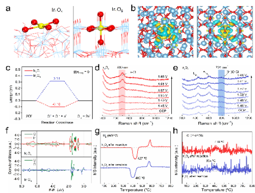 理论计算(DFT)结果和原位拉曼光谱(Raman)揭示了Ir单原子配位环境的差异对电极活性的影响机制。Ir1O4电极中配位不饱和的Ir是吸附Cl的活性中心,但在Ir1O6电极上则变成顶端配位的O。Ir1O4上更适中的Cl吸附能(更靠近0 eV)使得其更利于CER中Volmer过程(*/O* + 2Cl– → Cl*/ClO* + Cl– + e–)的发生,从而赋予其更优异的CER活性。