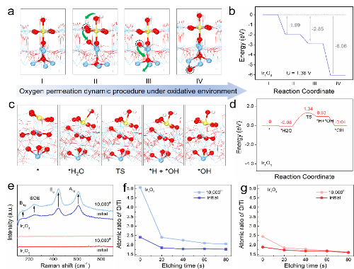 通过理论计算发现,在氧化条件下,由于OH的强吸附在Ir1O6上会自发地发生氧渗透过程,即表面的O物种会沿着排列规整的Ti-O-Ti通道逐步渗透到Ti基底的内部,进而增大氧化钛层厚度,最终钝化电极。而在Ir1O4上,被非晶化扭曲的Ti-O-Ti通道以及缓慢的水解离协同阻碍了氧渗透的发生,抑制了载体钝化引起的电极失活,进而赋予其优异的CER稳定性。