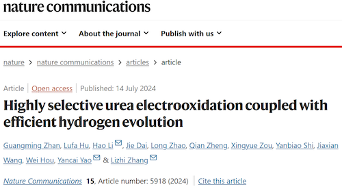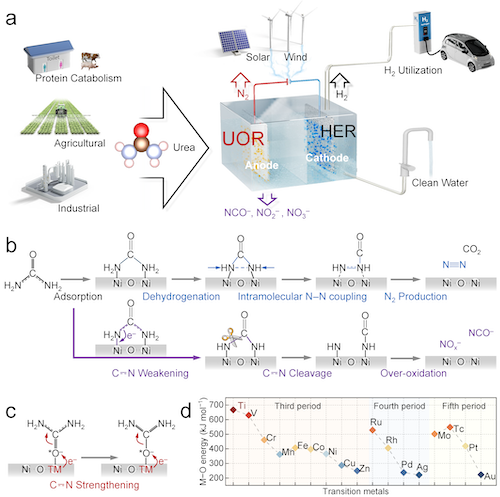 近日,韩国av 张礼知教授团队在自然•通讯《Nat. Commun.》在线发表了题为“Highly selective urea electrooxidation coupled with efficient hydrogen evolution”的研究成果。该团队发现非对称Ni–O–Ti位点可实现高选择性电化学尿素氧化至氮气,并揭示吸附构型依赖的尿素氧化分子机制。将尿素选择性氧化与阴极制氢耦合,为富尿素污水(如尿液)的绿色处理和清洁能源生产提供了新策略。论文第一作者为韩国av 博士后占光明和博士研究生胡路发,通讯作者为韩国av 长聘教轨副教授李浩、副教授么艳彩和特聘教授张礼知,第一完成和通讯单位均为韩国av 。