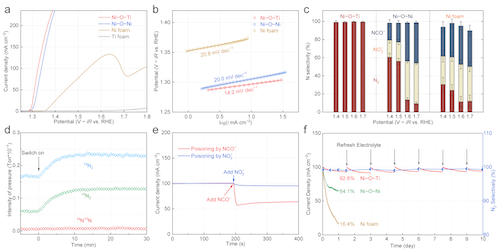 非对称性Ni–O–Ti位点在1.30 VRHE电位下即可实现10 mA cm–2尿素氧化电流密度。更重要的是,该电极尿素氧化的N2选择性高达99%,几乎不产生氰酸盐和(亚)硝酸盐有害产物,在长达10天的运行过程中始终保持出色的尿素氧化活性和N2选择性。含15N同位素的尿素氧化实验表明,生成的N2来自单个尿素分子内的N–N偶联。