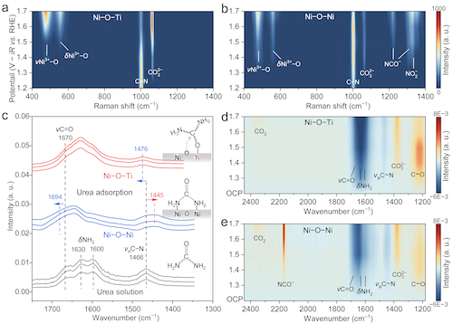 原位电化学拉曼光谱和傅里叶变换红外光谱证明,与传统的氮端尿素吸附构型不同,非对称Ni–O–Ti中的强亲氧Ti位点以氧端构型吸附尿素、向尿素分子的C⎓N键注入电子,导致C⎓N键红外振动蓝移,从而强化、稳定了C⎓N键,提高了尿素氧化至N2的选择性。