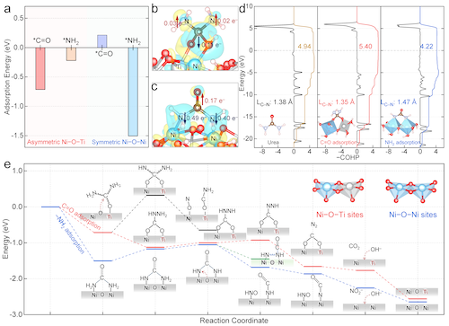 图5 DFT模拟阐明非对称性Ni–O–Ti位点尿素选择性氧化分子机制