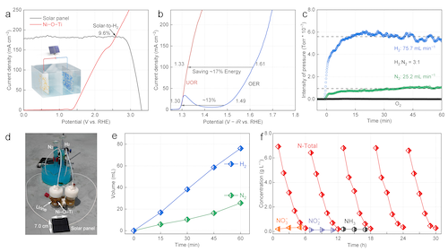 图6 太阳能驱动的Ni–O–Ti位点电解尿液耦合阴极制氢装置及性能测试