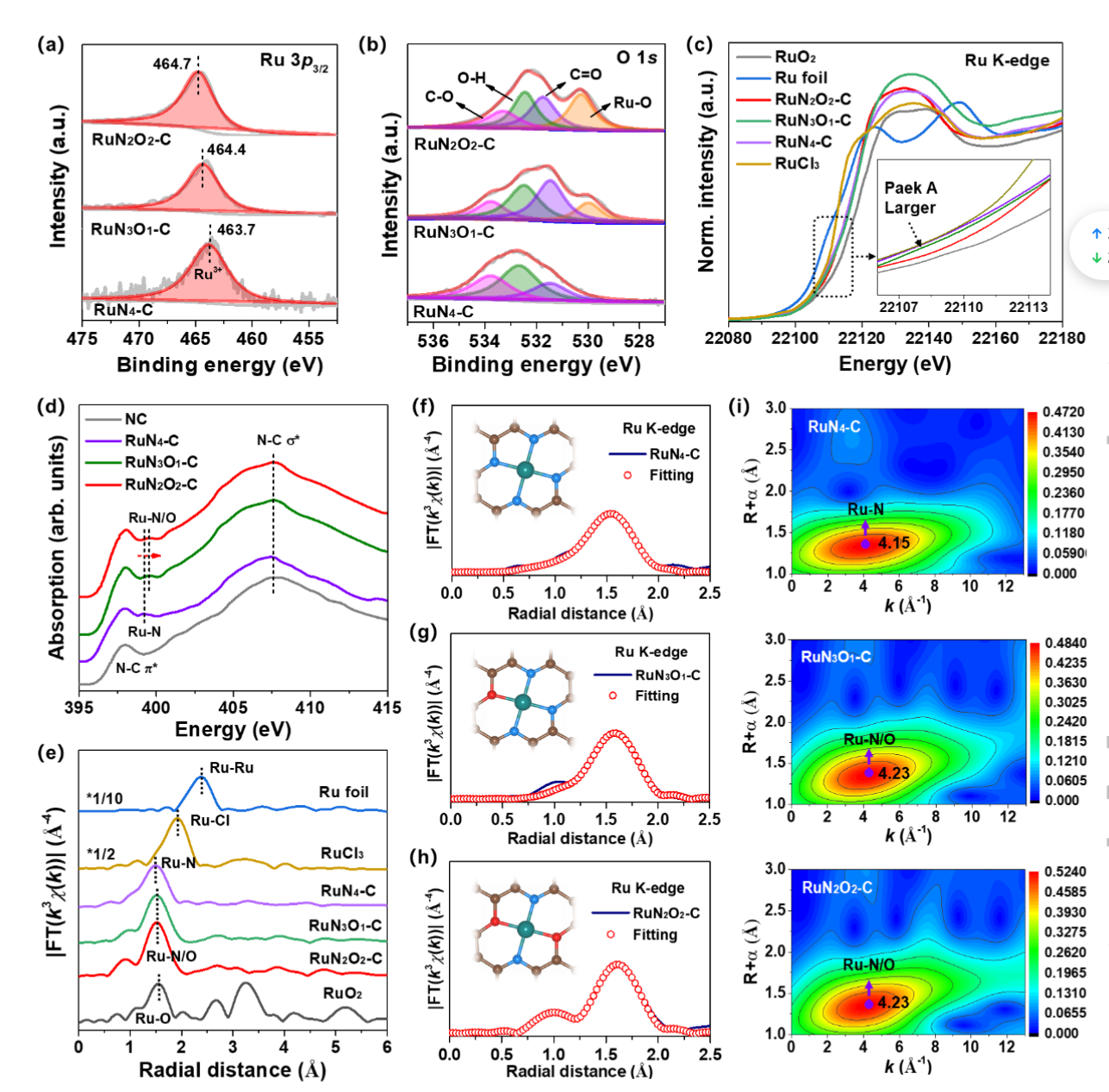 通过多种光谱技术揭示氧掺杂对钌单原子催化剂电子结构和配位环境的影响。核心数据包括XPS和XAS结果。XPS分析显示,氧掺杂使钌的价态升高,表明氧从钌轨道抽取电子,增强了钌的氧化态。XAS进一步揭示了氧掺杂后钌的局域对称性变化,表明RuN3O1-C具有非中心对称的电子分布。此外,EXAFS分析确认了Ru与N和O的双配位结构。这些结果对研究结论至关重要,证明了氧掺杂不仅改变了钌的电子结构,还优化了其配位环境,从而提升了催化性能。