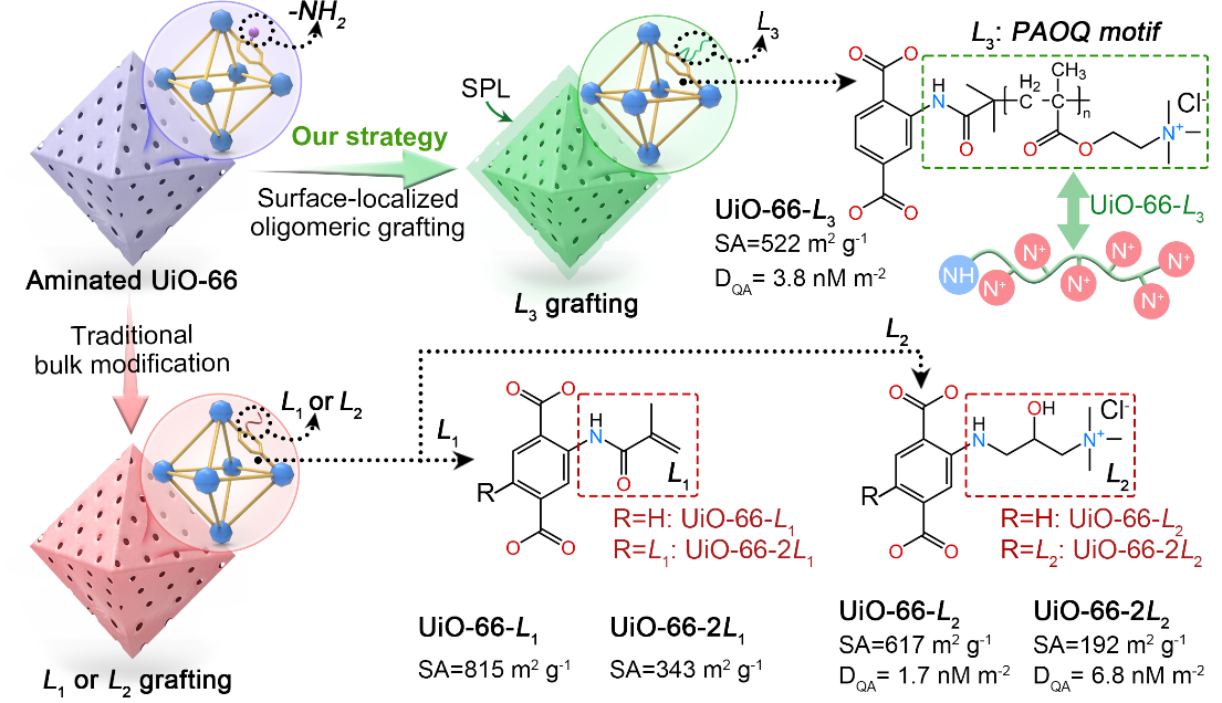 近日,韩国av 罗金明副研究员在《德国应用化学》(Angewandte Chemie)上发表了题为“Structure-Oriented Metal-Organic Framework Activation via Proximal Oligoalkyl Quaternary Ammonium Grafting Enhances Long-Chain PFAS Sorption”的研究成果。该研究成果突破传统MOF修饰局限,提出了一种表面局域化寡聚枝接策略,在UiO-66-NH₂表面精准构筑了邻近排列的寡聚烷基季铵盐(PAOQ)功能基元。该设计巧妙规避了MOF内部微孔的空间限制与传质壁垒,实现了功能基团负载量2.2倍的提升,并通过季铵盐与柔性烷基链的精确空间协同,实现了对长链PFAS的双模式高效捕获。