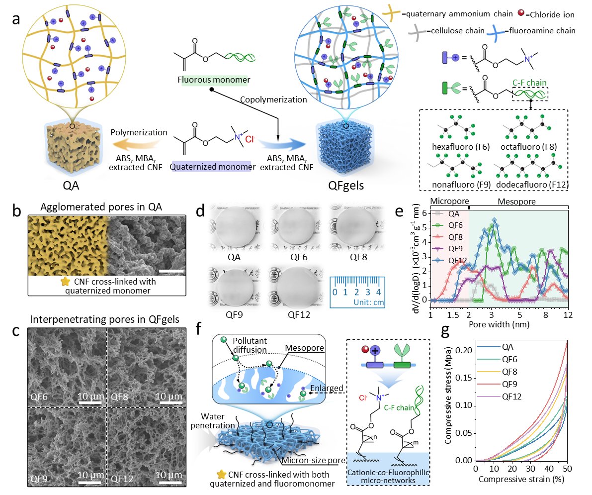 团队基于 PFAS“阴离子头部 + 氟碳链尾部”的两亲结构,创新提出“静电-氟亲性双协同”设计,成功合成QFgel水凝胶,其核心优势藏在两大关键特征中:(1)精准匹配的双功能位点:QFgel 通过自由基共聚工艺,在凝胶基质中均匀引入“季铵盐基团+氟代基团”:季铵盐提供持续正电荷,通过强静电作用捕获PFAS的阴离子头部;氟代基团则通过氟氟作用,精准锁定PFAS的氟碳链尾部。这种“双手抓牢”的设计,让材料对PFAS的选择性高达95%以上,完美规避其他污染物的干扰。(2)高效传质的多孔网络:对比传统季铵盐水凝胶的团聚结构,QFgel 呈现互穿多孔形态,兼具微米级通道(2.01-3.68 μm)和介孔(2-24nm),就像布满“快速通道”的海绵,大幅降低PFAS扩散阻力,为高效吸附奠定结构基础。同时,材料加入纤维素纳米纤丝增强机械性能,可耐受水流冲击与酸碱环境,满足实际应用需求。