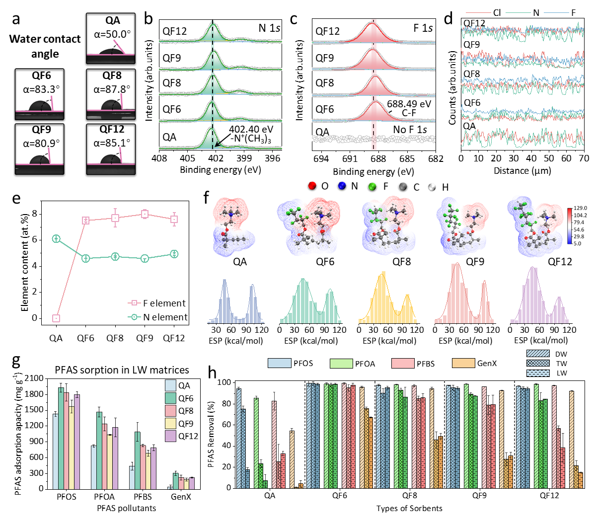 团队通过XPS、二维NMR、DFT计算等多种技术,在分子层面揭开了QFgel高效吸附的奥秘:静电作用是“主力抓手”:季铵盐基团的正电荷与PFAS阴离子头部形成强静电吸引,XPS 检测到吸附后季铵氮峰发生明显位移,证实两者紧密结合;亲氟作用是“精准锁钥”:2D NOESY 谱清晰捕捉到QFgel中氟原子与PFAS氟碳链的近距离相互作用(F-F接触),这种匹配性让材料在复杂体系中仍能选择性捕获PFAS;双位点协同增效:DFT计算表明,静电与氟亲作用的协同让PFAS吸附能低至- 0.35 eV,形成稳定的吸附复合物,而单一功能位点无法实现这种高效结合。