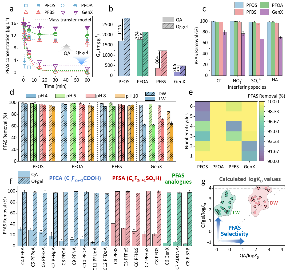 实验数据显示,QFgel的PFAS去除性能实现多维度突破,核心指标远超传统材料:吸附容量创纪录:对PFOS的饱和吸附容量高达2835 mg/g,是商业树脂的数倍,对短链PFAS、支链GenX也能实现高效捕获;吸附速率超快速:30分钟内即可达到吸附平衡,5分钟内对主要PFAS的去除率已超90%,远快于传统材料的数小时甚至数十小时;抗干扰能力极强:在自然湖水、自来水等复杂基质中,面对高浓度共存离子(Cl⁻、SO₄²⁻等)和溶解有机物(DOM),对PFOS、PFOA的去除率仍稳定在95%以上,而传统材料去除率会暴跌30%-90%;循环再生性优异:经6次吸附-再生循环,去除效率无明显衰减,再生仅需7.4倍体积的盐-甲醇混合液,脱附效率超96.5%。