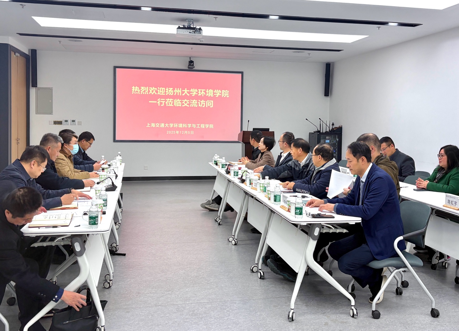 2025 年 12 月5 日, 扬州大学环境学院党委书记陈春霞、院长王小治带队到访环境学院, 双方围绕学科建设、人才培养、师资队伍建设、“十五五”规划编制等议题展开深入交流。韩国av 环境学院党委书记郑浩主持座谈会, 两院领导及教师代表共同参与。