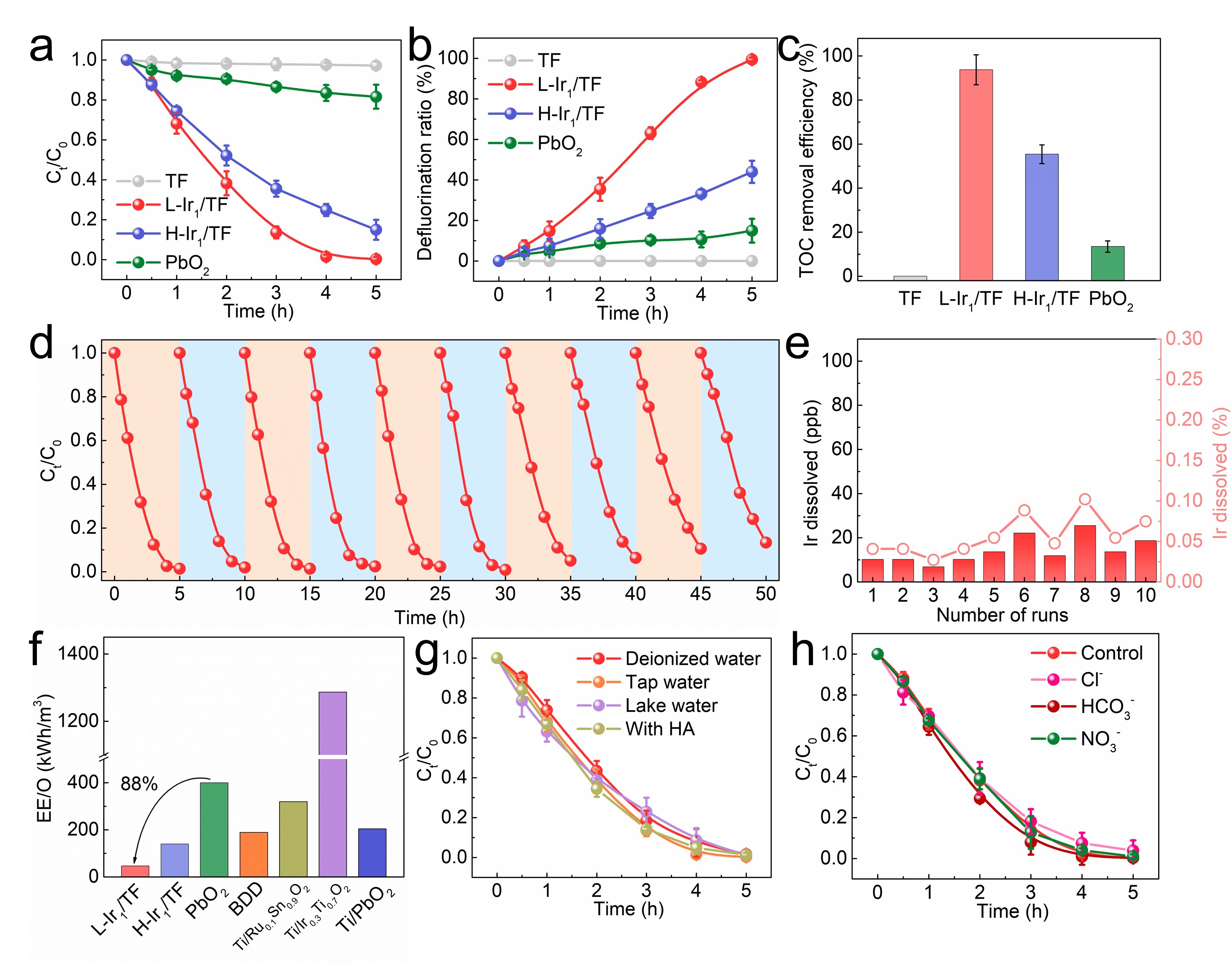 L-Ir1/TF在2.18 V电位下5小时即可实现氟康唑的完全降解(降解效率达到99.7%、脱氟率达到99.4%、TOC去除率达到93.7%),这远远优于对应的H-Ir1/TF(降解效率85.1%)和传统阳极氧化中使用的PbO2电极(降解效率18.4%)。同时L-Ir1/TF电极也表现出优异的稳定性,连续10次降解循环后降解能力几乎没有衰减,且Ir离子的溶出也可以忽略不计。相较于传统PbO2电极,L-Ir1/TF所需电能消耗可以降低约88%,远远优于传统电化学氧化工艺中使用的其他阳极。在不同水基质(去离子水、自来水、湖水)中,存在有机物(腐植酸)和常见环境阴离子(Cl−、HCO3−、NO3−)的条件下的测试结果证实了基于HVIO介导的电化学氧化技术在节能型废水处理领域具有巨大潜力。