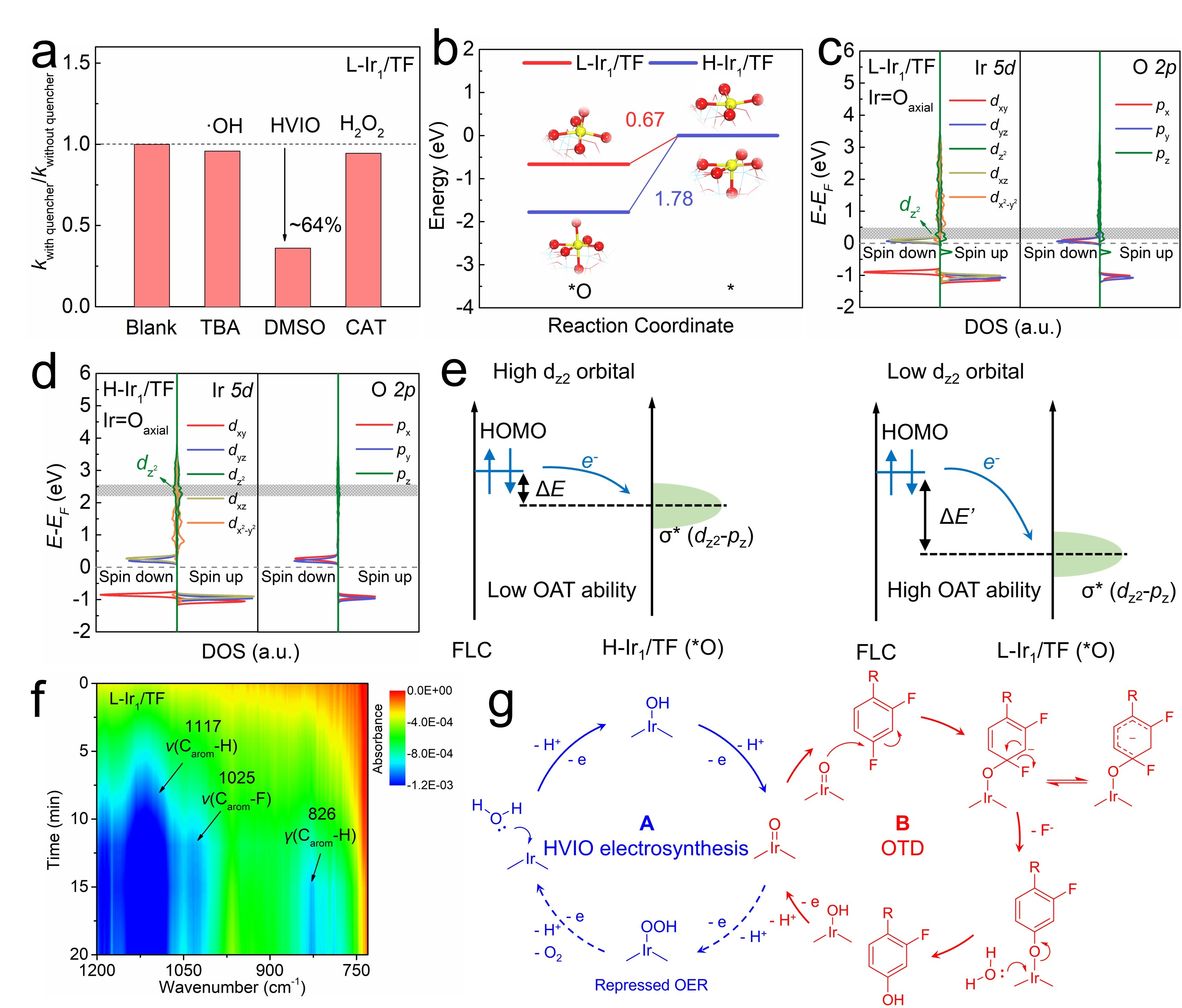 猝灭实验证实了HVIO为电化学OTD过程中的主要活性物种。理论计算结果表明L-Ir1/TF上HVIO的氧转移能力更强。这主要归功于下移的Ir dz2轨道能够促进电子从C–F最高占据分子轨道(HOMO)向Ir=O σ*轨道的转移。原位红外光谱(ATR-FTIR)证实了HVIO能够优先进攻C–F,该过程由亲电加成反应触发。