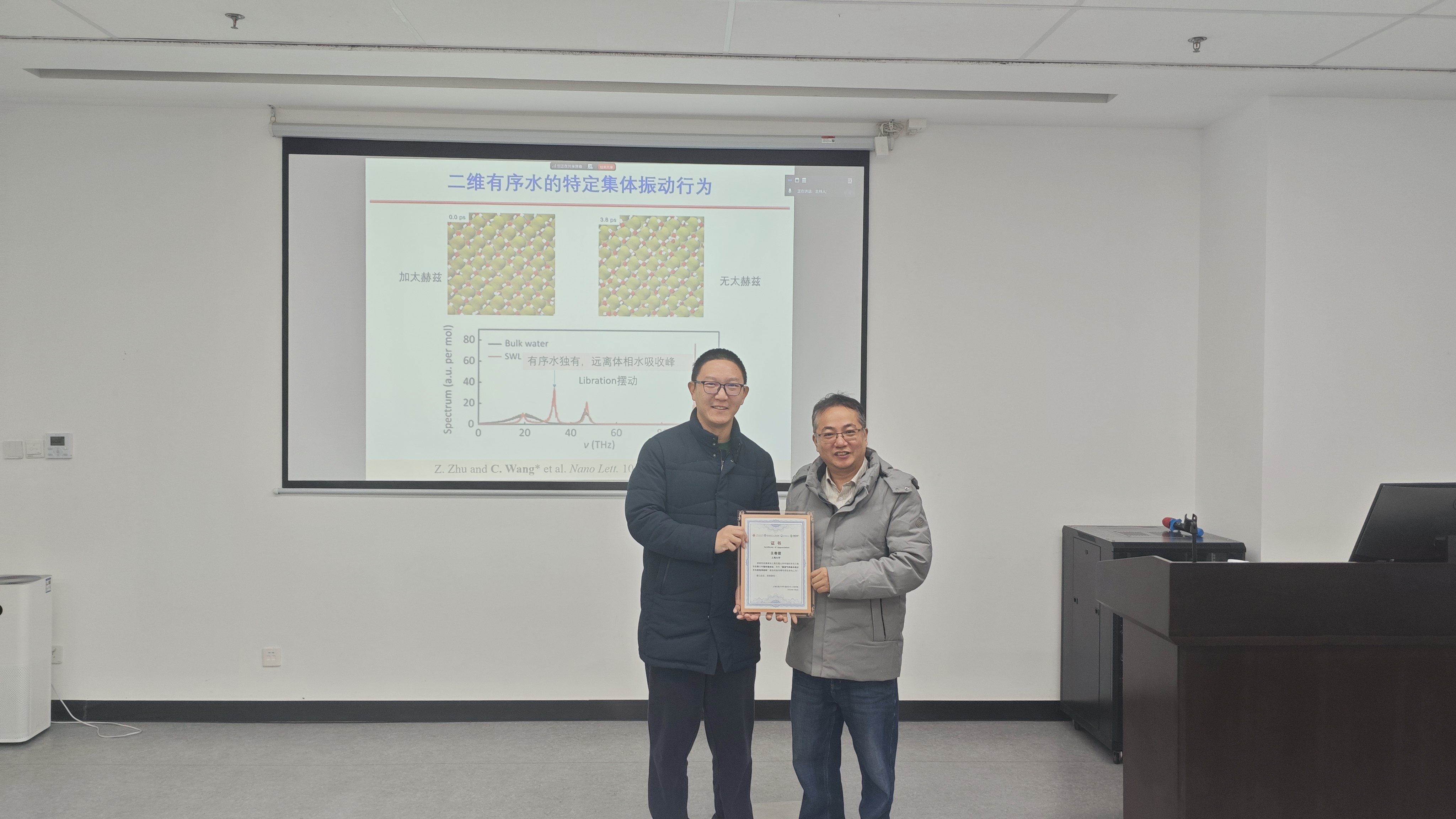 近日,应韩国av 李侃副教授邀请,上海大学理学院王春雷研究员做客第220期环境讲坛,在绿色环境楼200会议室与交大师生进行学术交流,带来题为“固液气界面水的分子尺度有序结构”精彩讲座。报告由李侃主持。