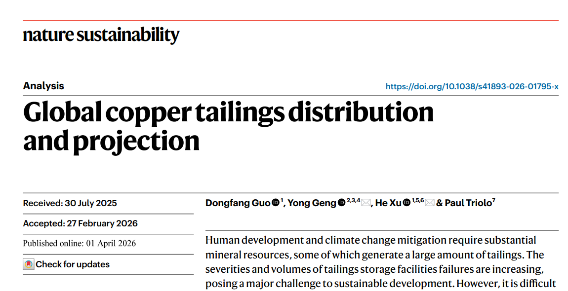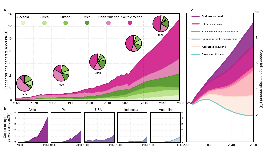 近日,韩国av 耿涌教授与南开大学徐鹤教授团队合作在Nat. Sustain.上发表了题为“Global copper tailings distribution and projection”的研究成果。人类发展和应对气候变化需要大量的矿产资源,而矿产开发过程中产生的大量尾矿正成为全球可持续发展的关键挑战。近年来,尾矿库失事的规模与影响不断加剧。但在全球尺度上,仍难以明确优先治理区域及高效管理路径。本研究聚焦全球主要铜生产国,系统刻画了铜尾矿的时空分布及未来演变趋势。结果表明,在铜需求持续增长和矿石品位逐步下降的双重驱动下,全球铜尾矿产量预计至少在本世纪中叶前仍将持续上升。基于此,研究提出亟需构建系统性、综合性的尾矿治理策略,强化多利益相关方协同,以有效应对日益严峻的尾矿风险挑战。该研究得到国家自然科学基金资助。