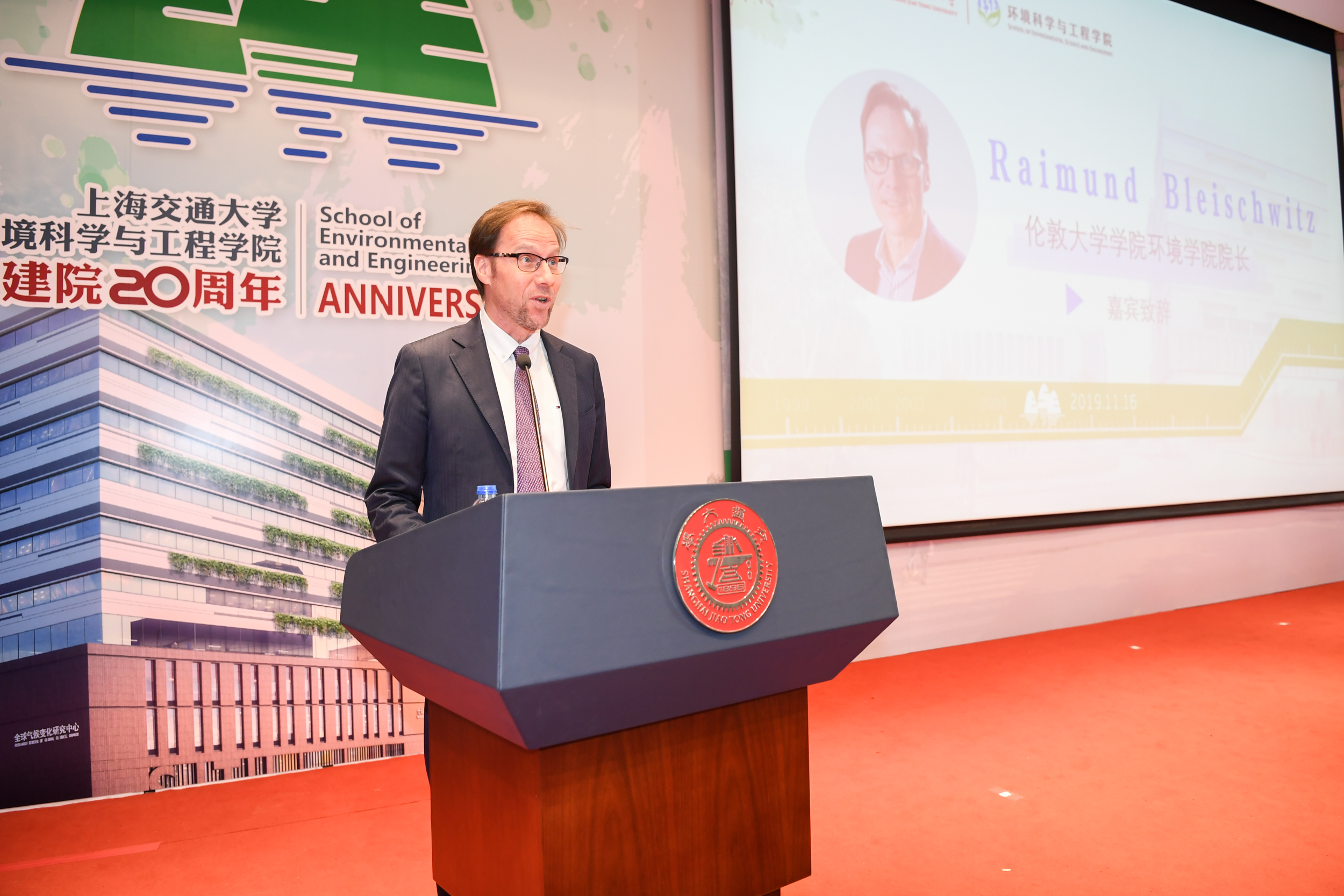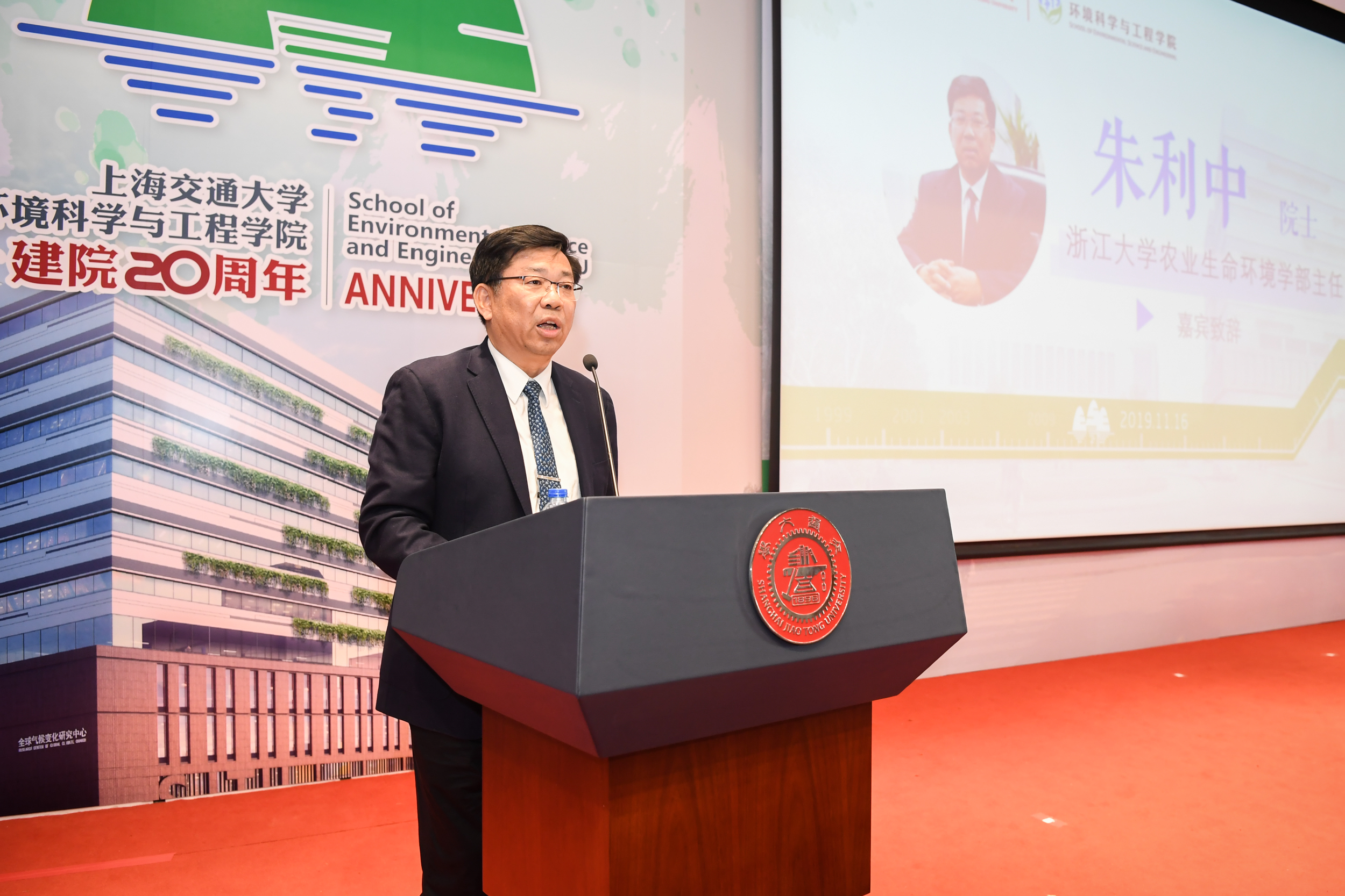 随后,国内兄弟院系代表、浙江大学农业生命环境学部主任朱利中院士发表致辞。朱利中表示,衷心希望交大环境学院能与兄弟院校的友谊越来越深厚,积极推进相近学科、专业之间的资源共享、优势互补,共谋发展,为建设世界一流的环境学科并肩奋斗。伦敦大学学院环境学院院长Raimund Bleischwitz与国际环境科学研究中心主席 Douglas Evans代表海外合作单位致辞,他们肯定了环境学院在国际化科研合作及办学项目的发展,同时也希望学院在环境领域研究的国际化发展道路上不断取得新成绩。