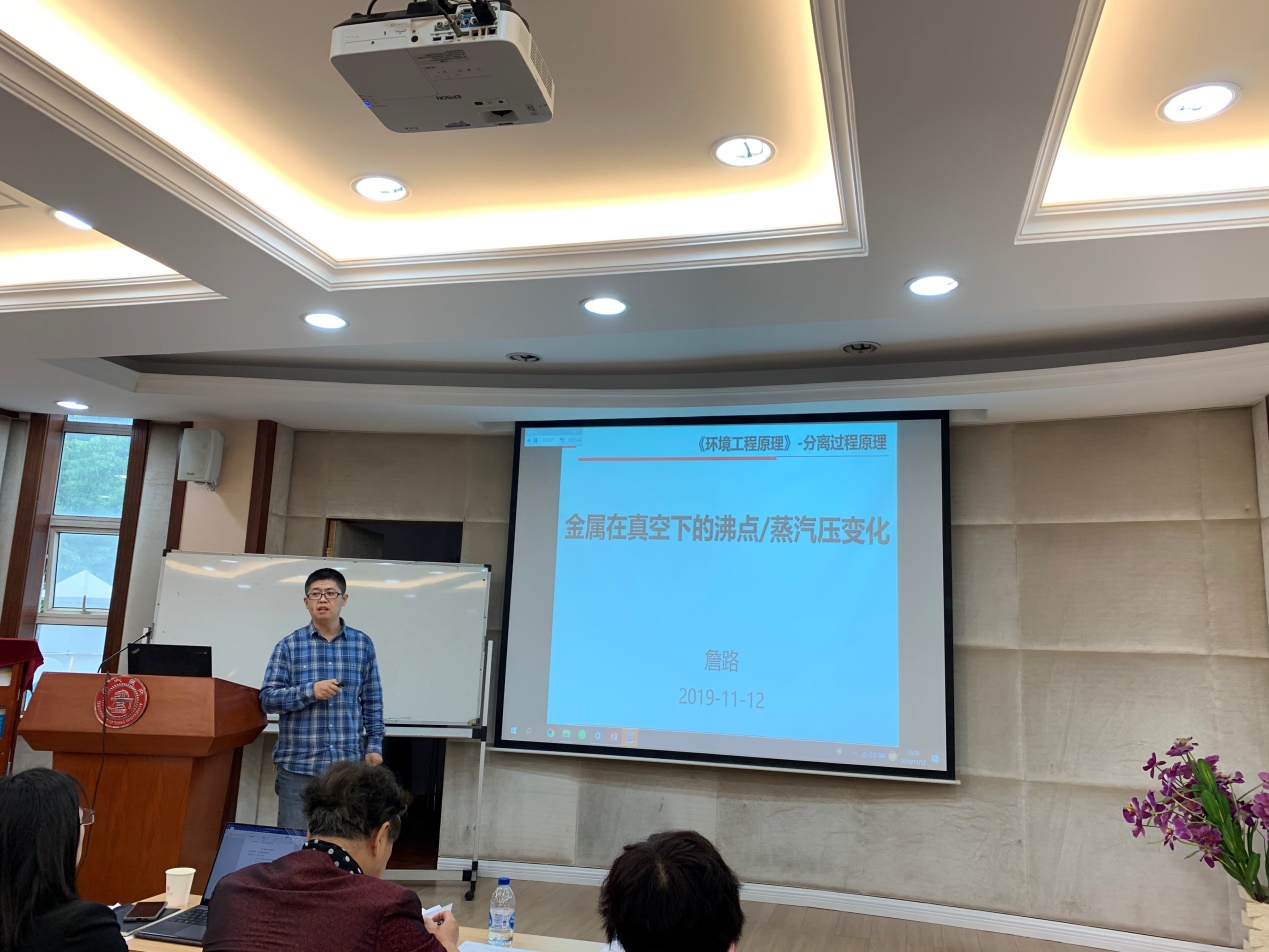 以“上好一堂课,上好一门课”为竞赛理念,本次竞赛由教学设计、课堂教学和教学反思三部分组成。李彭采用板书与PPT相结合的方式阐述了离心式水泵的工况点求解及其调速运行;刘婧宇以视频作为开场,用流利的英文进行了物质流分析;王春玲用“干将铸剑”的故事引出上课主题,展示了固/固相反应动力学的相关内容;詹路则以两个生活中常见的自然现象为例,一步步引导着大家学习了金属在真空下的沸点/蒸汽压变化;赵砚彬结合当今实时案例,讲解了动物实验和人体暴露研究的伦理规范。