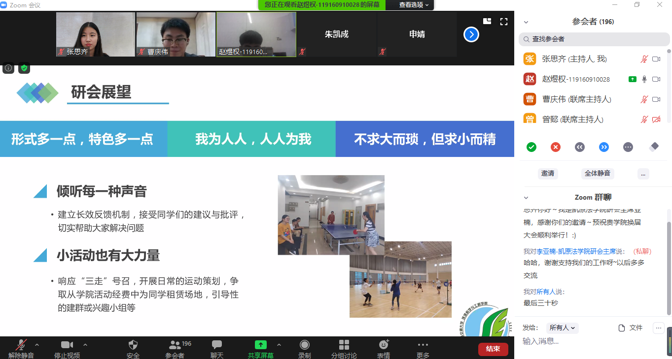 韩国av 校研究生会执行主席林云鹏同学为本次大会致辞,他肯定了环境学院从广大师生群体的切身利益和需求出发举办的一系列学风学术和文体娱乐活动,并线上云合影留念。