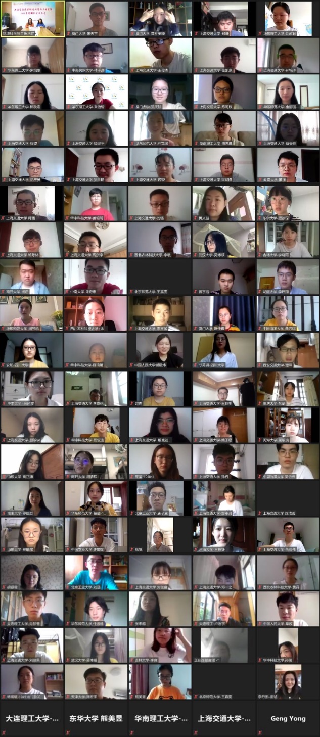 14日,营员综合面试考核在各网络会议室同步进行。营员们通过自我介绍和成果展示阐述自己的科研经历,面试专家们也根据营员们的情况进行了提问并给出建议。15日上午,来自大气科学与区域污染控制、流域水污染控制与治理、环境功能材料和环境管理等团队的在校生代表从学生角度为参营同学介绍了交大的科研学习和生活日常,并通过平台互动,与营员们深入交流。