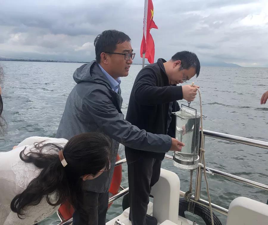 汇报结束后,任家荣一行乘船巡察洱海,考察洱海各观测采样点。王欣泽介绍了日常观测采样流程,并现场演示了洱海透明度和浮游植物优势种鉴别等指标的观测方式。