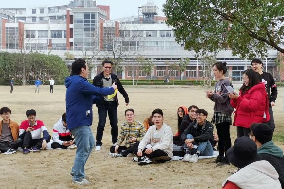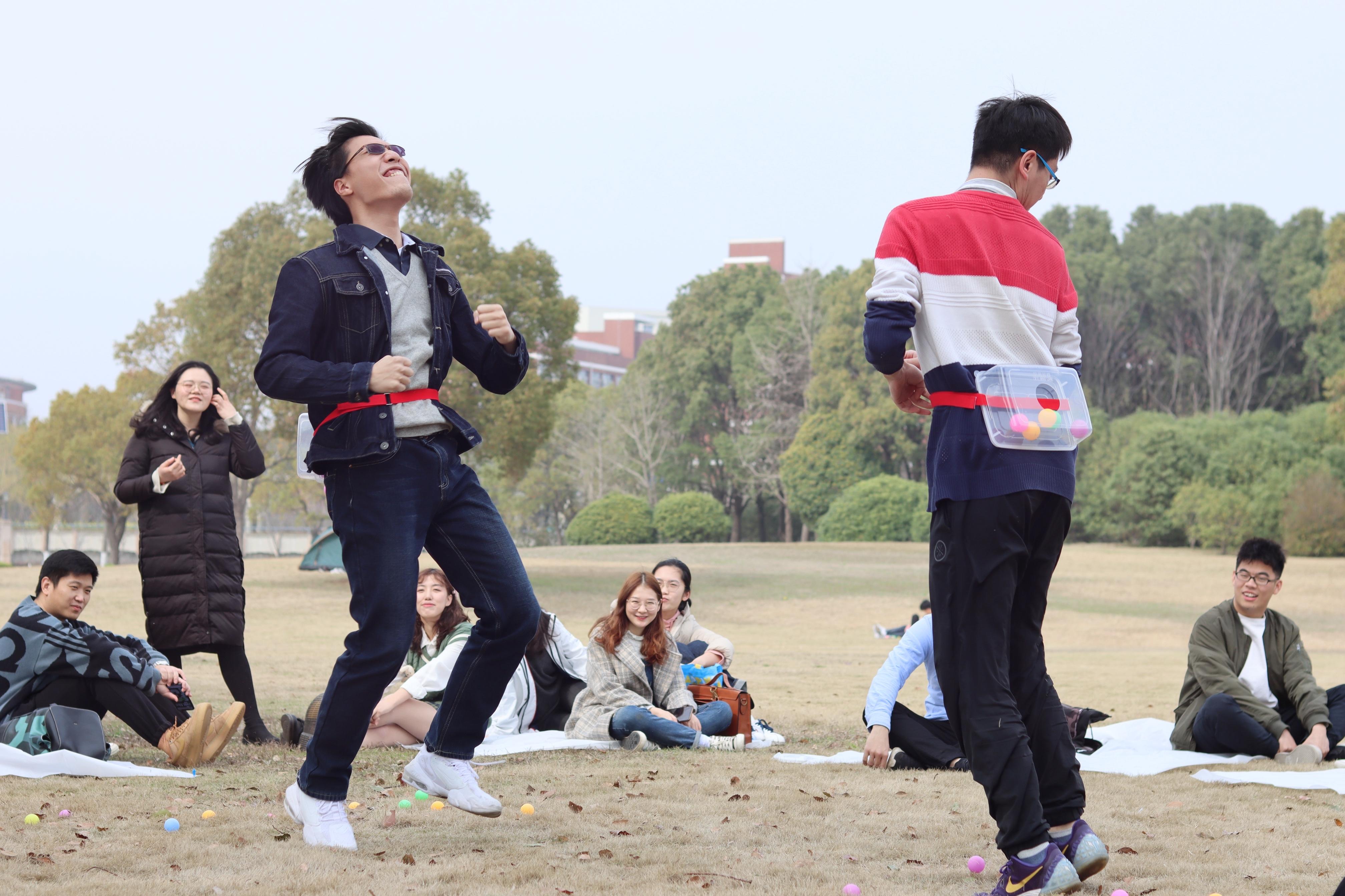 第一个小游戏:抖球。两两一组进行PK,计时一分钟内抖出的球数记为各组该轮的分数。抖球游戏活跃了全场的气氛,大家在欢声笑语中更加熟悉彼此,也增强了同学之间的交流。