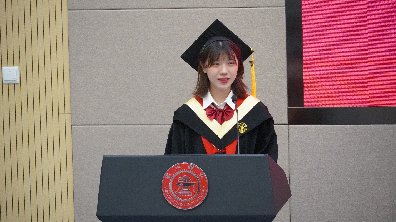 F17级邹幸玥作为学生代表发言,她说到:在交大环境学院的四年里,一次又一次的尝试、思索、磨砺和进步,让脚踏实地、爱国奉献的交大精神融入每一个交大毕业生的血液里,不断激励着我们做出无愧于青春,无愧于时代,无愧于人民的选择与贡献。也许征途漫漫,也许风雨兼程,愿你我以自强不息为楫,乘风破浪,扬帆远航,无愧于“饮水思源,爱国荣校”的校训,将青春融入祖国的山河!