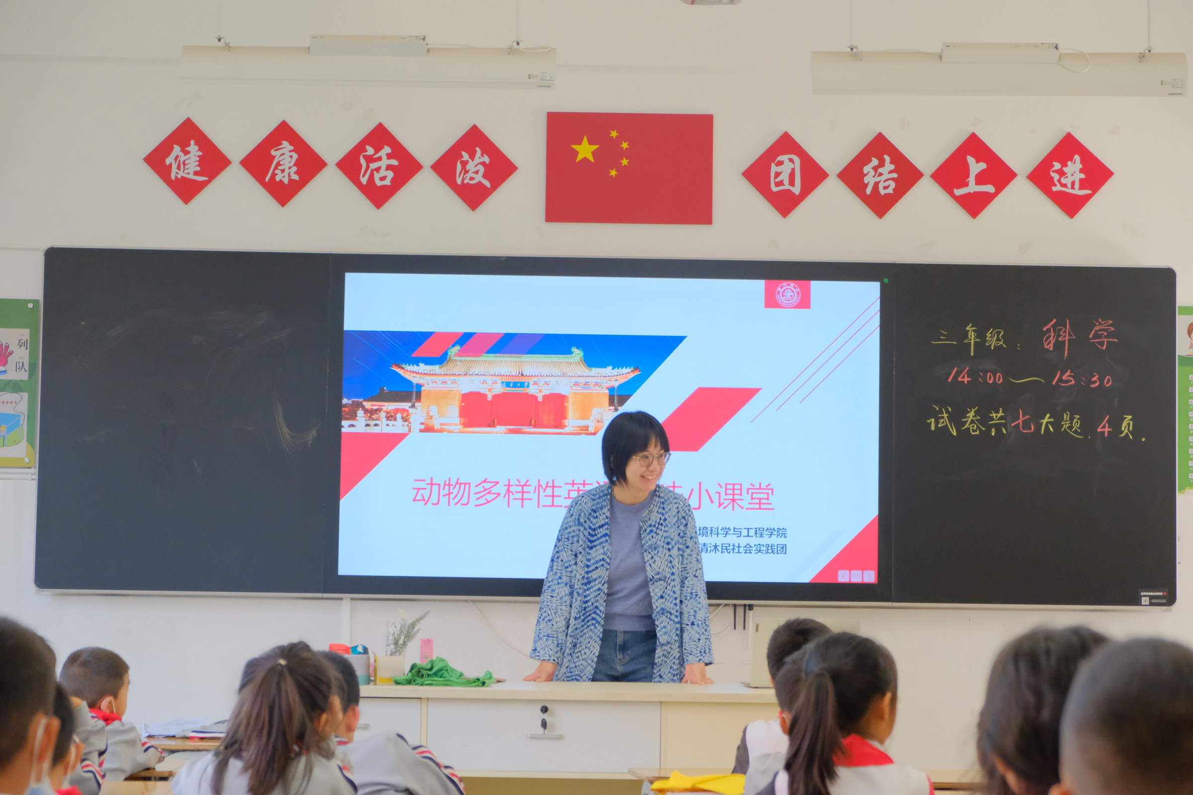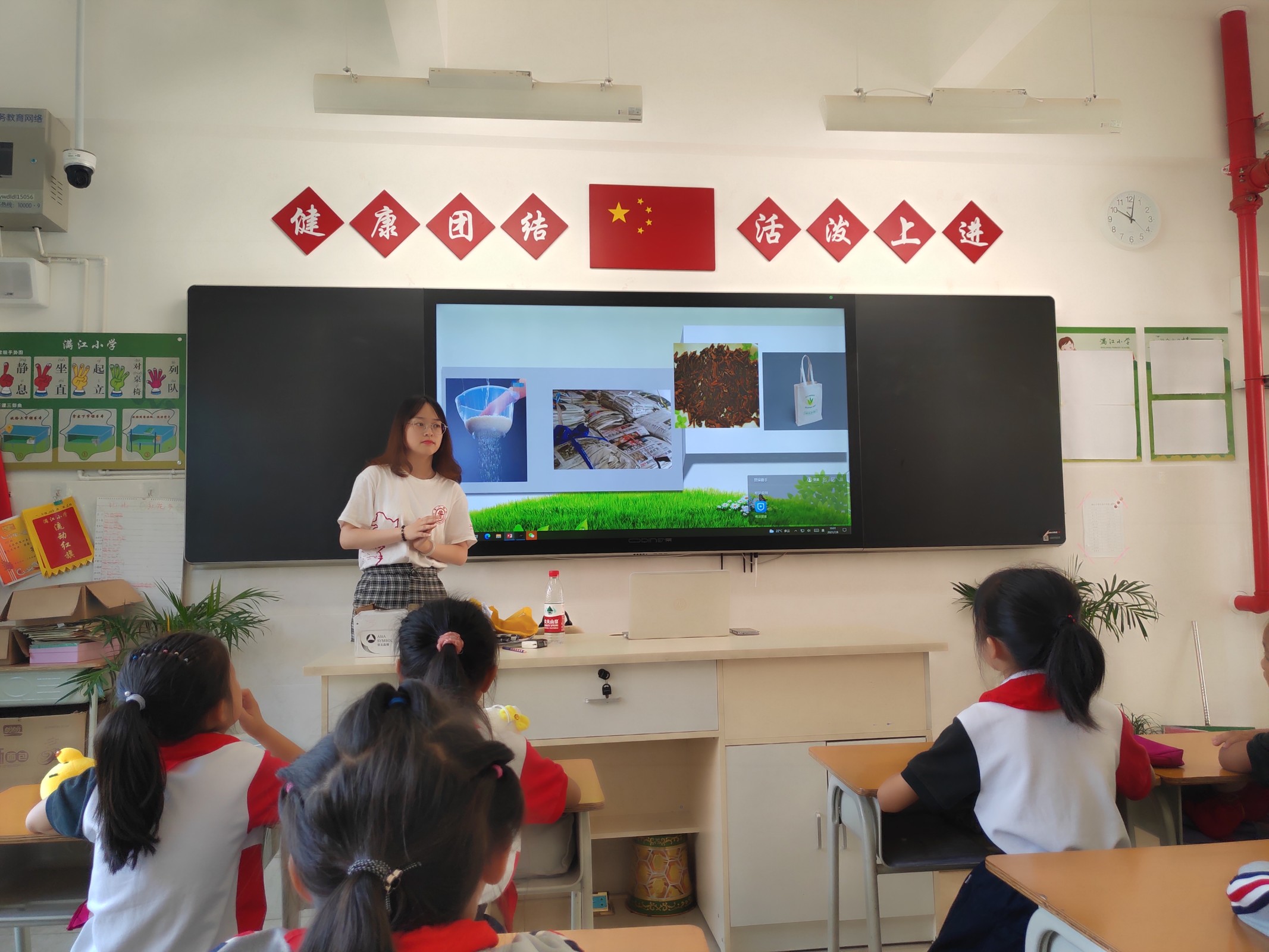 为提倡同学们养成良好的环保生活方式,保护地球环境贡献自己的一份力量,B班课堂的主题为“低碳生活,绿动你我”。实践团成员陆宏为学生们开展了垃圾分类的课堂,通过知识小竞赛的方式使同学们了解垃圾分类的意义并学会正确垃圾分类。课堂最后,同学们集体宣读了低碳公益行动承诺书,承诺做到低碳生活,呵护地球。