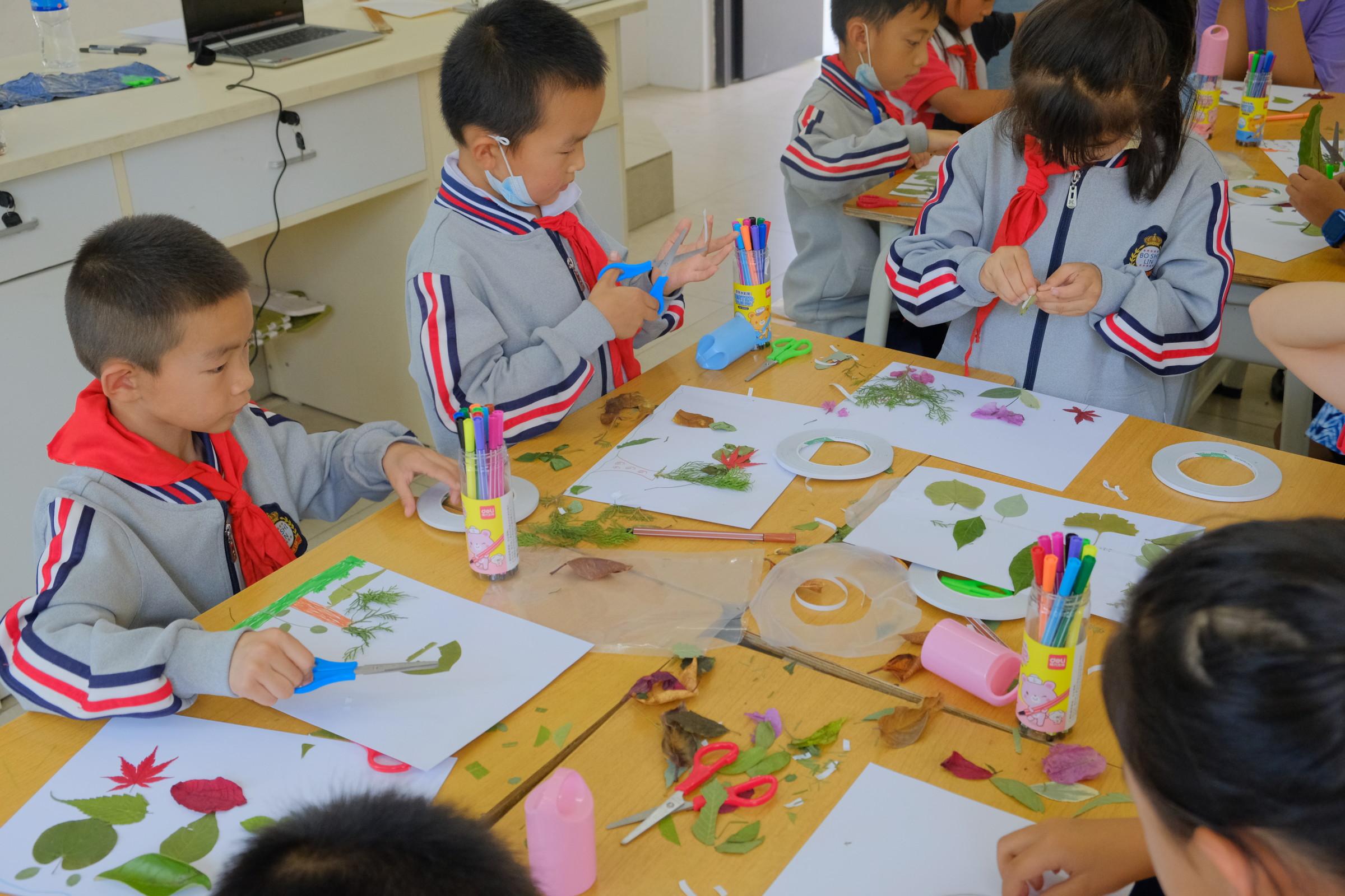与此同时,B班小朋友进行了一堂“变废为宝”的手工课——利用落叶来创造美丽的图案,创作出心中的美丽家园。在课程活动中,强调了落叶也可以变为美丽的画,不采摘花草,不破坏生态,让小孩子接受变废为宝,珍惜自然的教育。