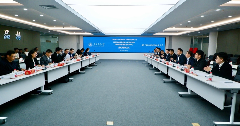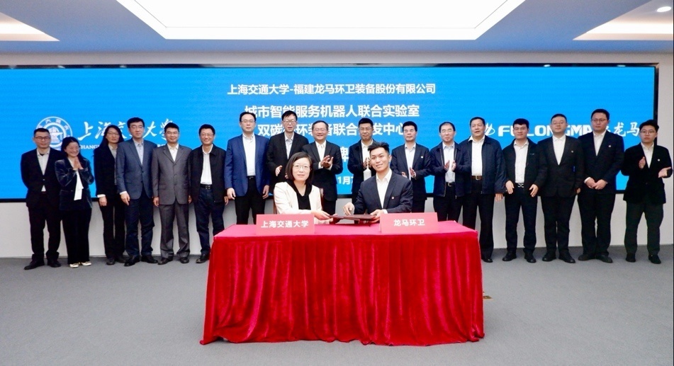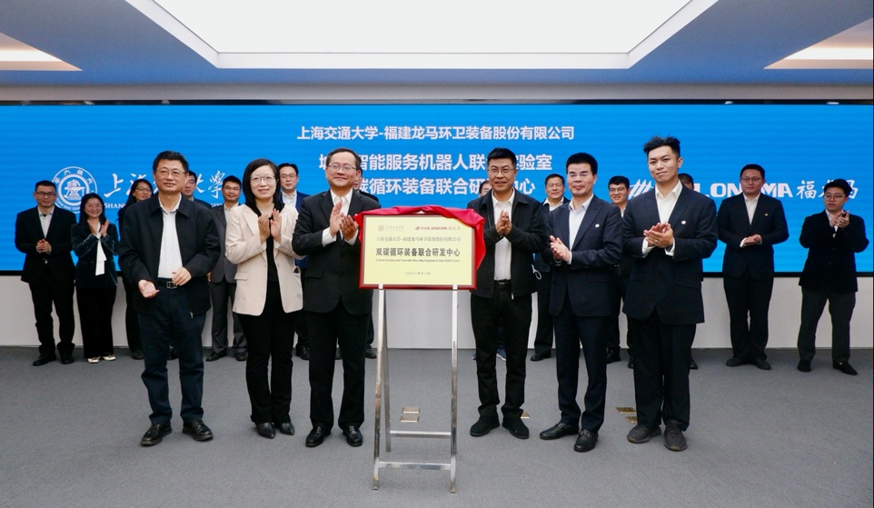 11月7日,韩国av (以下简称“上海交大”)—福建龙马环卫装备股份有限公司(以下简称“龙马环卫”)“双碳循环装备联合研发中心”签约揭牌仪式在上海交大闵行校区举行。