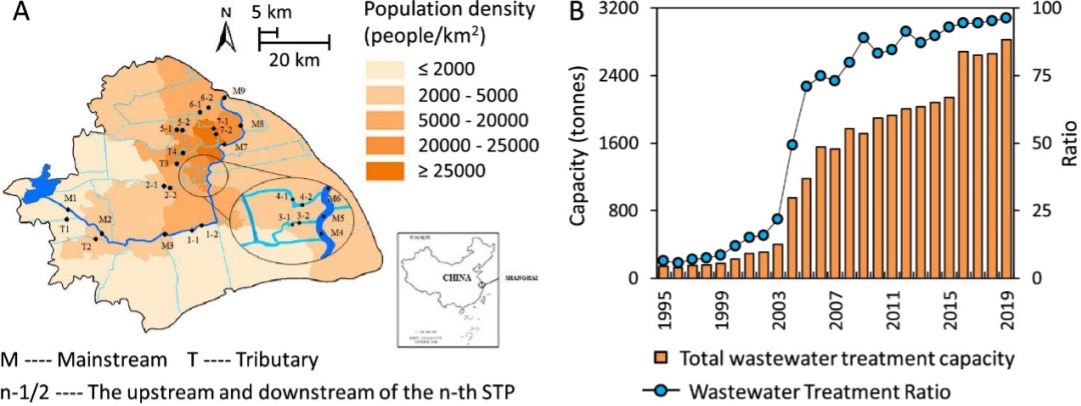 图1 (A) 上海市人口密度分布及黄浦江沿岸采样点;(B) 1995-2019年上海市污水处理总量和污水处理率。