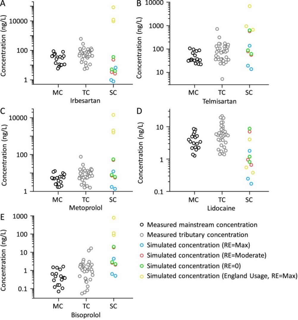 图4 在不同情景下心血管和降脂药物的模拟浓度和实测浓度比较。(情景1,2,3均采用中国目前人均药品用量,情景1:高污水厂去除率(RE=最大值,假设药物易降解);情景2:中等去除率(RE=中等);情景3:去除效率为0(RE=0);情景4采用英格兰人均药品用量,高污水厂去除率(RE=最大值)。MC:实测干流浓度;TC:实测支流浓度;SC:模拟浓度)。