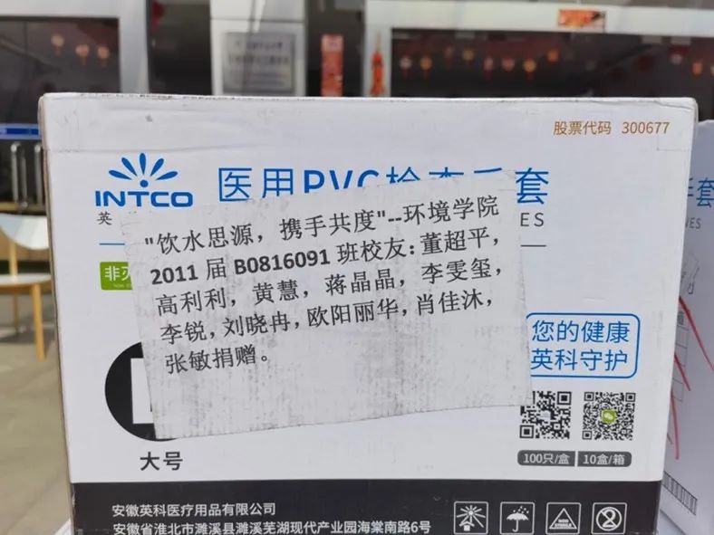 3月13日,在得知校内紧缺防疫物资后,环境学院2011届B0816091班校友董超平、高利利、黄慧、蒋晶晶、李雯玺、李锐、刘晓冉、欧阳丽华、肖佳沐、张敏连夜联系供应商,捐赠26箱防护物资(含洗手液喷雾、防护服、面罩、手套、酒精2.5L(75%)),以“环院速度”将满满爱心第一时间寄送到校内“战友”的手上。