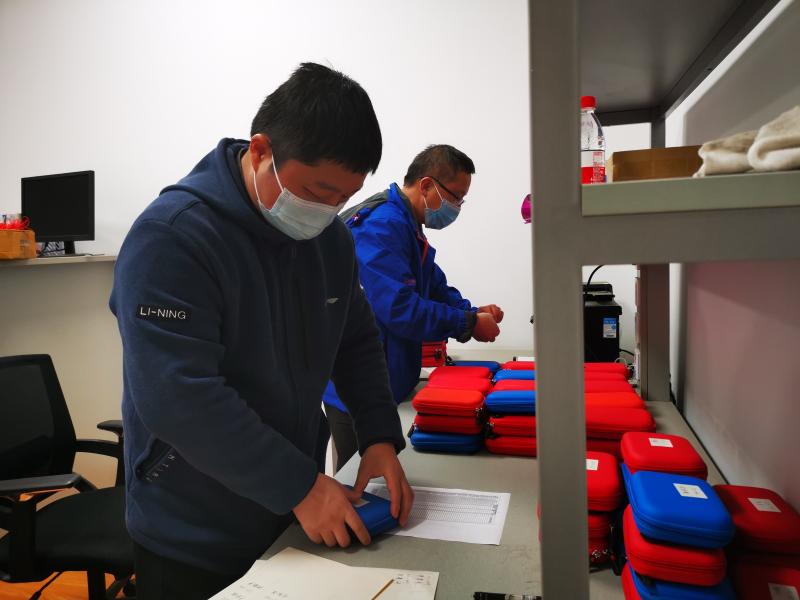 图说:准备好实验用电路板后,诸勤敏、吴林晟根据名单填写学生宿舍信息便签,并在每份器材上贴上标签