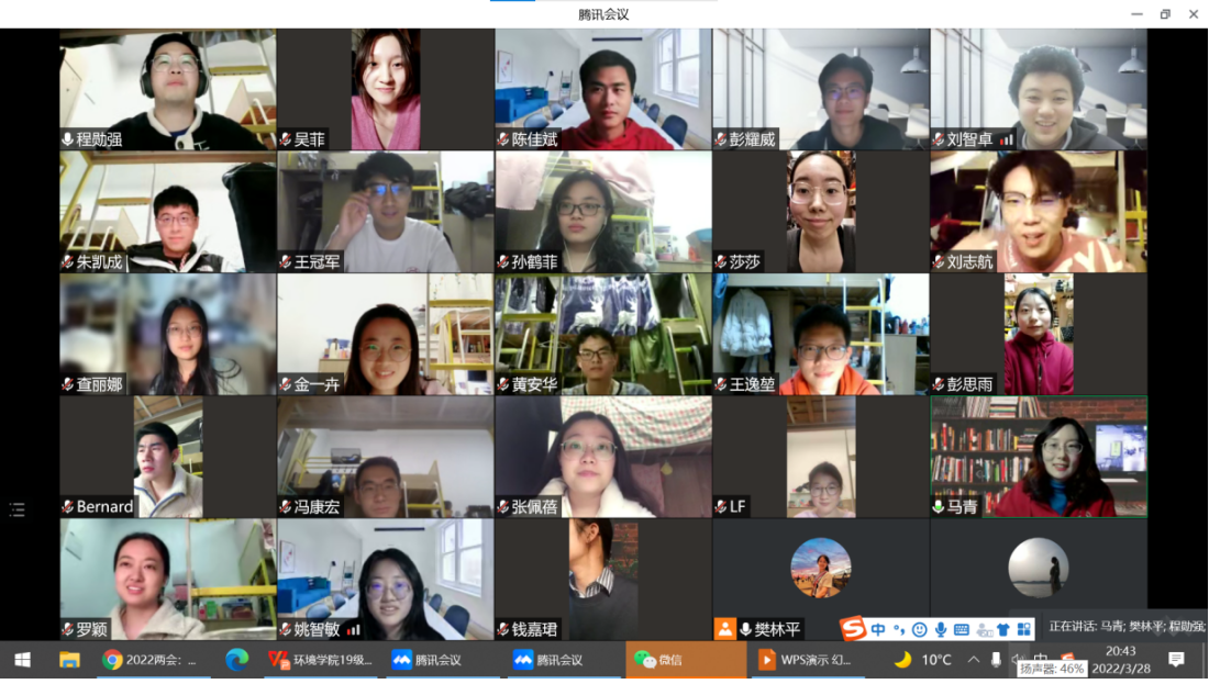 为深入学习贯彻2022年全国两会精神,切实把思想行动统一到党中央重大决策部署上来,3月28日晚,环境学院2019级硕士生党支部组织全体党员召开“学两会,战疫情,话担当”线上主题党日活动。学院党委组织员马青列席会议。本次会议由2019级硕士生党支部书记程勋强主持。
