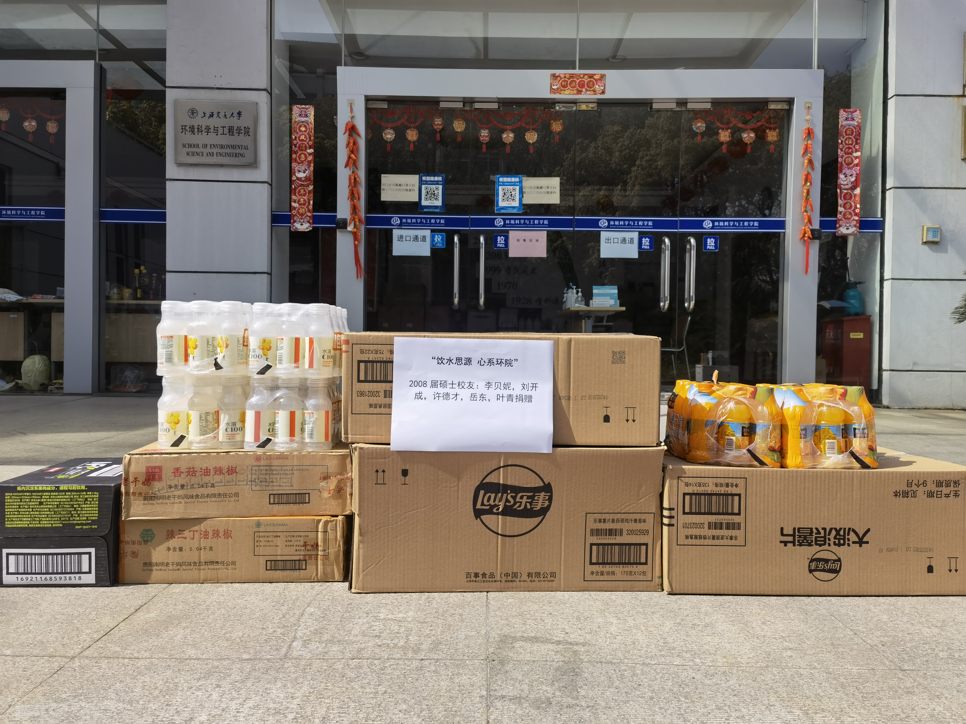 环境学院2005级硕士校友李贝妮、刘开成、许德才、岳东、叶青捐赠2箱薯片、2箱老干妈、1箱酸奶、3箱果汁。为了尽快运抵一线,校友许德才驾驶私家车亲自将物资送至学校门口,从采购到送达仅用2小时。