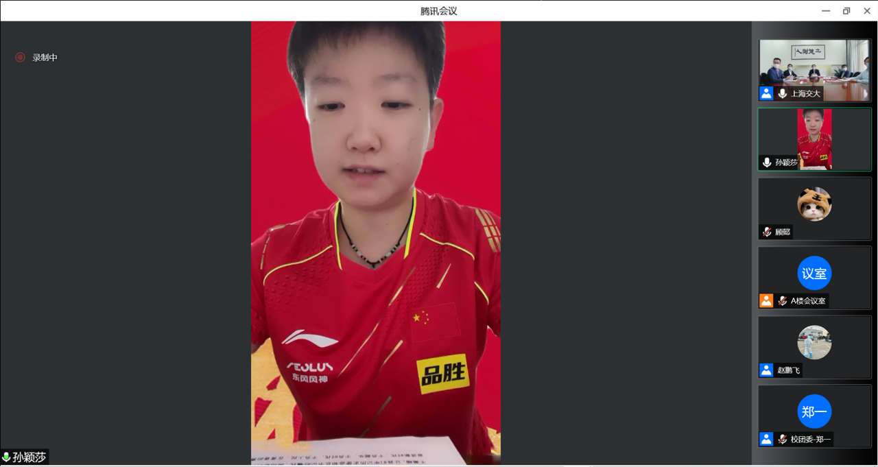 奥运冠军、全国青联委员、安泰经济与管理学院 2019 级本科生孙颖莎分享了自己因热爱而执着、为梦想而奋斗,在逆境中不沉沦、在顺境中不止步的奋斗故事。她表示:“对我来说,每一件被汗水浸透的队服都是对伟大祖国的青春告白;对大家来说,一次次一丝不苟的实验、一场场向祖国山海的奔赴,是大家为实现中华民族伟大复兴中国梦而奋斗的坚实脚印。”她号召大家,作为新时代青年要继续发扬五四精神,延续爱国奋斗的传统,牢记历史使命,在青春的赛道上奋力奔跑,全力跑出当代青年的最好成绩。